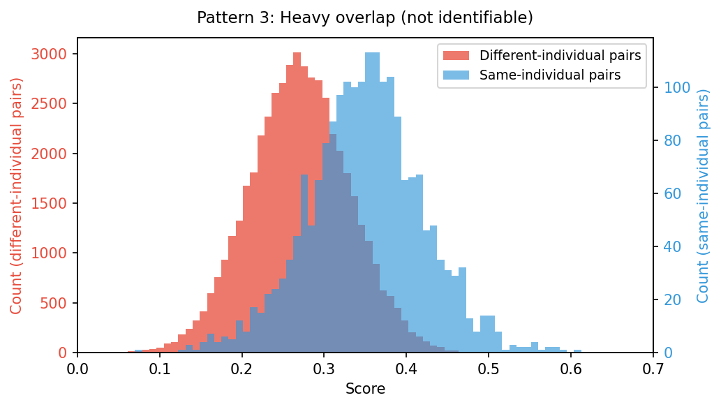 - Same-individual-pair scores: distribute around 0.3 to 0.5