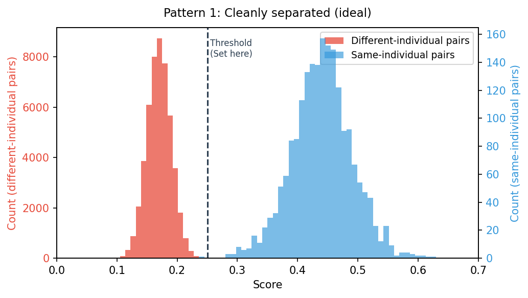 The different-individual-pair distribution and the same-individual-pair distribution are completely separate, with a score range of empty space between them. Place the threshold anywhere in that gap, and same-individual and different-individual pairs are reliably distinguished. This is what an identifiable target looks like. The wider that empty range is across your verification samples, the more robust the system is to imaging variation in production, and the higher your confidence.