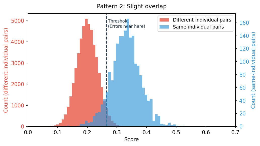 - Plot two separate histograms, one for same-individual-pair scores and one for different-individual-pair scores (x-axis: score, y-axis: number of pairs that landed at that score)